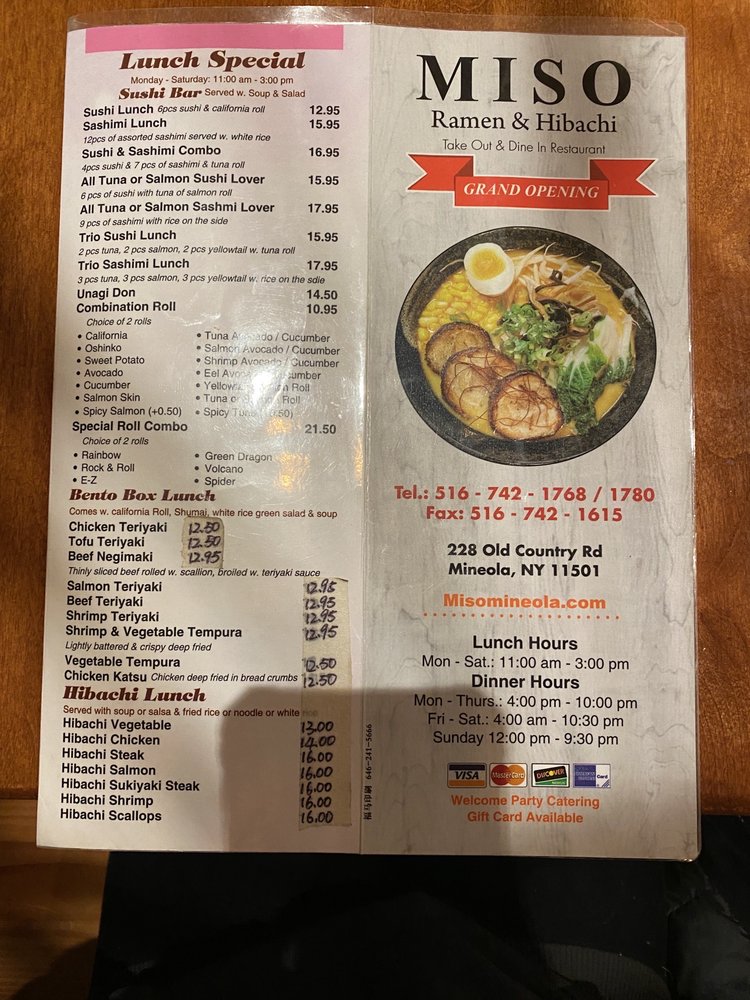 Miso Ramen and Hibachi, located in Mineola, NY, offers a diverse menu with vegan options and a variety of amenities such as delivery, takeout, and reservation options. The restaurant's kitchen serves delectable appetizers like Age Dashi Tofu and Crispy Calamari, while the sushi bar offers dishes like Pepper Tuna and Sashimi Appetizer. The soup and salad section includes favorites like Miso Soup and Grilled Salmon Avocado Salad. With a cozy and intimate ambiance, this women-owned establishment provides a unique dining experience suitable for groups or a romantic dinner. Whether you're craving traditional ramen or fresh sushi, Miso Ramen and Hibachi has something for every taste bud. Don't miss out on their Happy Hour specials and drive-thru convenience..relax and enjoy the culinary delights of Miso Ramen and Hibachi at 228 Old Country Rd.